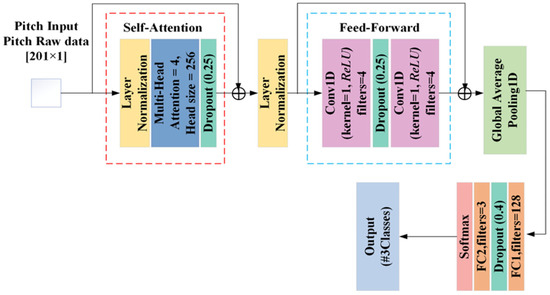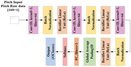 The Pitch-based CNN model is based on three sequential convolutional blocks, each of which consists of a 1D-convolution layer, a batch normalization layer, and a ReLU activation function layer, respectively. The extracted features, go through the global average pooling 1D to turn 3D original features into 2D features with batch sizes and flattening vectors to yield a final fully-connected (FC) layer, corresponding to the number of classes, that is, three filters with SoftMax activation to verify the correctness with label vectors as depicted in Figure 10.