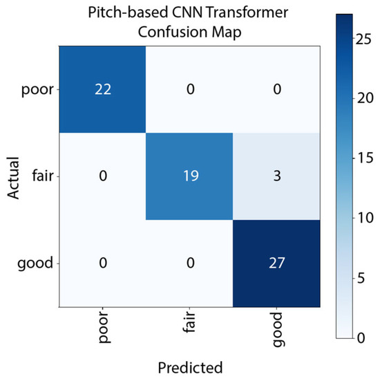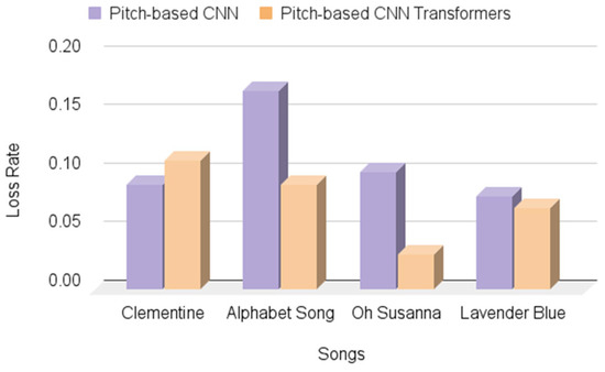 The results of the internal comparative bench test of the pitch-based group, the results on investigation through the use of songs like the Skip to My Lou show that our approach investigates the measurement at 94.37% for Pitch-based CNN, whereas the best performance is conducted through Pitch-based CNN Transformers, which was evaluated at 97.18%. In comparison, F1-score, Precision, and Recall metrics are up 3.1%, 2.9%, and 2.8%, respectively when compared to Pitch-based CNN. This verification shows it to be superior to the majority of Skip to My Lou song outcomes. Therefore, Pitch-based CNN Transformers has the most accurate prediction of the Skip to My Lou song. Pitch-based CNN Transformers has examined the best performance evaluation of all models, as shown in Table 4 and Table 5.