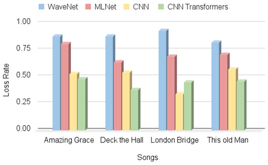 In this section, the experiment will be divided into two major groups containing all 18 songs for kids, which will be evaluated separately for each model. According to each group’s timbre-based model (timbre-based WaveNet, timbre-based MLNet, Timbre-based CNN, and Timbre-based CNN Transformers), the second group consists of pitch-based (Pitch-based CNN and Pitch-based CNN Transformers). There will be vastly different outcomes, and each will use the criteria to investigate the distribution of the rate of accurate prediction across the three categories: “Good”, “Fair”, and “Poor”. The following elements define the piano evaluation system’s accuracy (in percent) as shown in Equation (6).