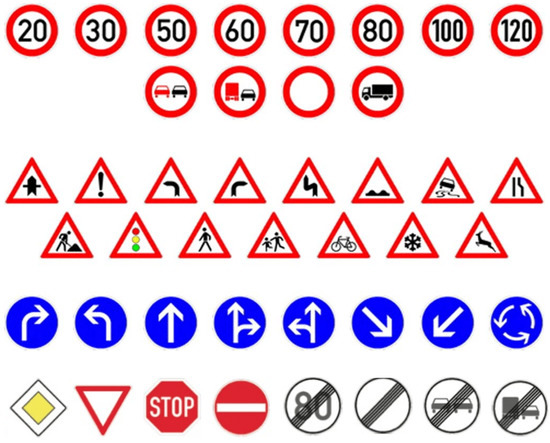 The German Traffic Sign Recognition Benchmark (GTSRB) dataset comprises 51,922 images saved in the Portable Network Graphics (PNG) format. The dimensions of the images in this dataset range from 15 × 15 pixels to 250 × 250 pixels. The GTSRB dataset was divided into three groups to train, validate, and test the model: 31,433 images for training, 7859 images for validation, and 12,630 images for testing. It consists of 43 distinct categories (as shown in Figure 2), such as prohibitory signs, danger signs, and mandatory signs. Each category includes 100 and 1000 images, providing a comprehensive and diverse range of images to train and test the model’s ability to recognize various traffic signs.