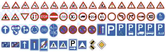The Belgium Traffic Sign (BelgiumTS) dataset comprises 7095 images, saved in Portable Pixmap (ppm) format. This dataset includes 4575 images used for training and 2520 images for testing. The dimensions of the images in BelgiumTS vary from 11 × 10 pixels to 562 × 438 pixels. In contrast to the GTSRB dataset, the BelgiumTS consists of 62 different traffic sign classes (as shown in Figure 3). However, this dataset contains fewer training samples than the GTSRB dataset, which can make classification more challenging.