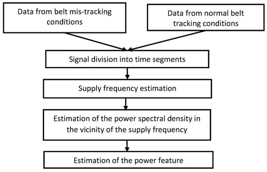 The proposed evaluation of the power feature is illustrated via a flow chart in Figure 1. In this evaluation, two sets of current data from the conveyor, one under mis-tracking condition and the other under a pristine condition, were gathered separately and divided into time intervals. The integrated power was computed around the fundamental harmonic of the supply frequency.