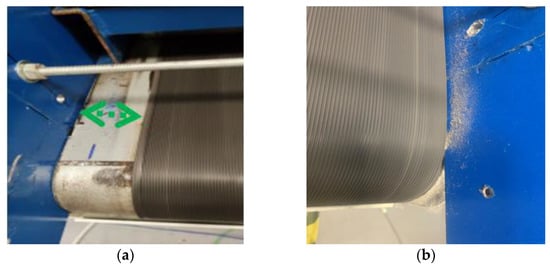 Figure 3a shows a side of the conveyor, where a suitable distance (shown by the green arrows) is provided between the conveyor metal wall and the belt. In contrast, Figure 3b shows the case in which the metal wall is in contact with the belt (i.e., a belt mis-tracking), resulting in the loss of small pieces of the belt due to friction with the metal wall.