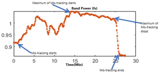 Eighty minutes of current data were investigated for two loading conditions. Longer experiments for mis-tracking were not conducted, as that could significantly damage the belt. To evaluate feature diagnosis effectiveness for a belt mis-tracking under a no-load condition, the values of the power feature for a belt mis-tracking are plotted in Figure 5. The time of each event is also marked in the plot. In Figure 5, the power feature has a higher value at the starting point of the belt mis-tracking compared to the normal belt tracking condition of operation. The power feature increased from the time of initiation of a mis-tracking/contact to the time the maximum belt mis-tracking started. During the maximum of a belt mis-tracking, the value of the power feature reached its maximum and was almost constant. It decreased as the experiment progressed from a belt mis-tracking condition to a normal belt tracking condition at the end of the experiment.