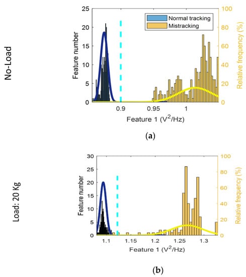 To compute the overall probability of true diagnosis, the normal (i.e., the Gaussian) probability density function (PDF) for each histogram was computed and the intersection points between two PDFs were selected as decision-making thresholds (i.e., the Bayesian rule, see Figure 7, aqua dotted lines). If the power feature for a normal belt tracking condition has a lower value than the decision-making threshold, normal belt tracking is considered to be correctly diagnosed. If the power feature for a belt mis-tracking condition has a higher value than the decision-making threshold, belt mis-tracking is considered to be correctly diagnosed. The estimates of the total probabilities of correct diagnosis by the proposed technology are 100% and 99% for no-load and 20 kg load conditions, respectively see Figure 7a and Figure 7b respectively. It can be seen that the estimates of the total probabilities of correct diagnosis were high, so the normal belt tracking and belt mis-tracking cases were successfully diagnosed.