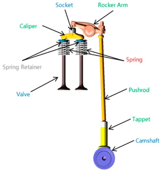 The internal combustion engine is an essential power source in various fields, including transportation, industrial machinery, and power generation. In a four-stroke internal combustion engine, the valve train plays a vital role in regulating the intake and exhaust processes, which are essential for generating power. The valve train system is responsible for controlling the opening and closing of the intake and exhaust valves during the suction, compression, explosion, and exhaust processes. For diesel engines, the intake and exhaust valves are crucial components that contribute significantly to the combustion chamber’s air intake and exhaust gas expulsion during the suction and exhaust processes, respectively. As illustrated in Figure 1, the valve train system includes several mechanical elements such as a camshaft, tappet, pushrod, rocker arm, valve spring, and valve seat, which work in coordination to ensure the proper operation of the valves in accordance with the engine’s crankshaft rotation.