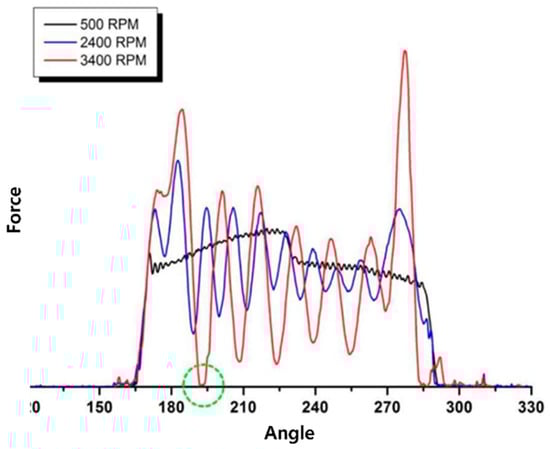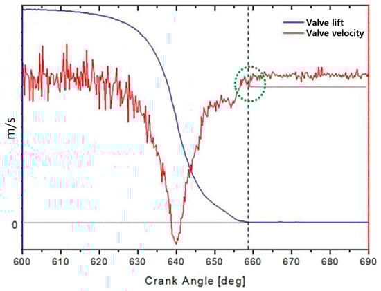 Valve seating velocity is defined as the speed at which the valve comes to rest on the valve seat. As depicted in Figure 3, it is necessary to confirm if the valve seating velocity, at the moment the valve lift reaches zero, meets the target speed as indicated by the green circle. When the target speed is exceeded, it adversely affects the valve train noise, the occurrence of valve seat wear, and the durability of the components [].