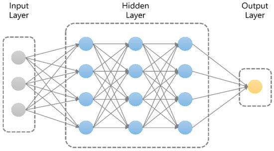 A deep neural network (DNN) is a type of artificial neural network (ANN) that comprises multiple hidden layers positioned between the input and output layers, as illustrated in Figure 5. The learning process of DNNs involves a repeated error backpropagation procedure that updates weights to minimize the loss function’s value via optimization functions such as pure propagation and stochastic gradient descent.