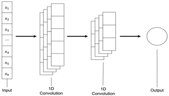 Although a 2D-CNN kernel is widely used in image classification, the use of a 1D-CNN kernel, as shown in Figure 6, is gaining popularity in other areas such as natural language processing, signal processing, and time series analysis [,]. 1D-CNNs can capture important temporal features in data sequences, which makes them well suited for processing time-series data. Additionally, they can be used for feature extraction in natural language processing, where they help to capture local patterns and relations between words.