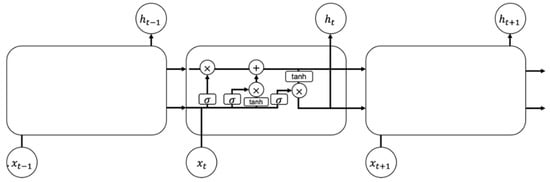 Long-short term memory (LSTM) is a specialized form of recurrent neural network (RNN) designed to tackle the issue of gradient loss in existing RNNs. The LSTM architecture comprises a hidden layer node, referred to as an LSTM memory cell, which integrates three gates: an input gate, a forget gate, and an output gate, as depicted in Figure 7. The memory cell can erase unnecessary information, update new information, and output pertinent information. The LSTM’s strength in retaining long-term memory is crucial in remembering significant features for prolonged periods, which can aid in enhancing performance in time-series-forecasting and language-modeling tasks [].