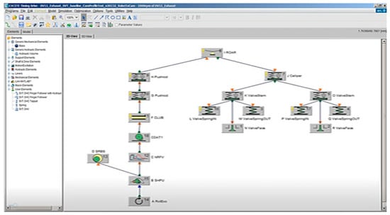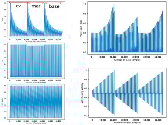 The dataset employed in this research was obtained from AVL’s EXCITE Timing Drive Dynamics analysis program [], which provides dynamic characteristics of valves during the engine development process for three different engine specifications: Base, Marine, and CA. The dataset comprises information on valve dynamic characteristics, as shown in Figure 8. The data are collected during the engine development process, and the program is used to obtain the relevant information.