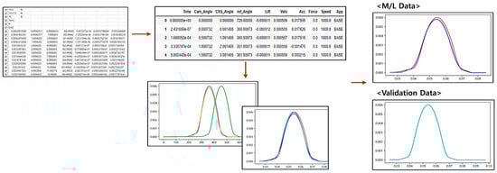 The data preprocessing process utilized for model learning is presented in Figure 10. Firstly, the valve train dynamic characteristic analysis raw data file for the three CAM profile specifications obtained through the analysis program was imported into Python. A dataset was then generated by adding speed and App (Application) columns to differentiate the engine rotation speed and specifications for each CAM profile. Secondly, to align the lift axes of the three specifications, the maximum value of the lift was examined, and the crank shift (CRS) angle data were processed to match the maximum axes of the lift for each specification. Thirdly, the CRS angle section (row) that is not necessary for learning was removed, and all data were merged. Finally, the Mar and CV specification data were categorized as model learning data, and the Base specification data were categorized as data to be verified in the generated predictive model.