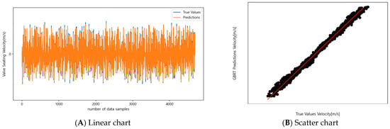 Figure A4 displays a comparison graph of the predicted and actual values of the valve seating velocity for the entire engine revolution range (1000–3500 RPM) for both the GBRT and 1D-CNN models, as shown in (A) and (B), respectively. The predictions of both models for the entire engine revolution range are comparable, and fall within the development target value, demonstrating an almost identical level of correspondence with the actual value.