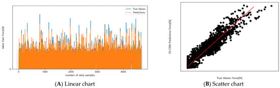 Table 7 presents the results of the predictive performance comparison between the GBRT and 1D-CNN models for valve train force. The GBRT model achieved superior performance with an R2 of 0.90, RMSE of 204.19, and MAE of 108.43, while the 1D-CNN model demonstrated an R2 of 0.89, RMSE of 221.44, and MAE of 119.08.
