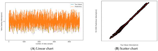 Table 5 displays the evaluation outcomes, indicating that the LSTM model achieved the highest performance for the training dataset, while the 1D-CNN model demonstrated the best overall performance for the test dataset. Figure 13 depicts the prediction results of the valve train force for the test data of the 1D-CNN model. In contrast, in the prediction of valve seating velocity, Table 6 indicates that the 1D-CNN model demonstrated the most favorable outcomes across all performance metrics. Furthermore, Figure 14 showcases the prediction results of the valve seating velocity for the test data of the 1D-CNN model.