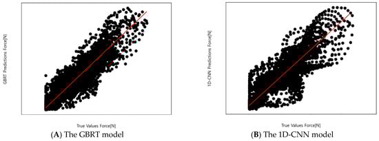 Figure A2 illustrates the valve train force for all engine revolutions as predicted by the GBRT and 1D-CNN models, presented in (A) and (B), respectively. The red circle highlighted in Figure A2 represents the valve train system section where contact loss occurs, resulting in a minimum force of 0. Both predictive models demonstrate similar levels of correspondence with the actual value across the entire range of engine revolutions (1000–3500 RPM).