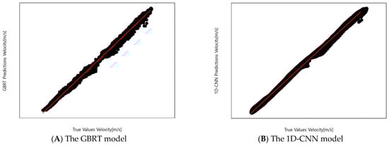 Furthermore, Table 8 displays the comparison results of the two models for valve seating velocity. In this case, the 1D-CNN model outperformed the GBRT model with an R2 of 0.98, RMSE of 0.07, and MAE of 0.05, whereas the GBRT model exhibited an R2 of 0.97, RMSE of 0.09, and MAE of 0.06.