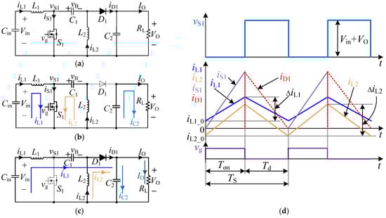 Operation mode B: When the turn-on time reaches the target value, S1 is turned off, operation mode A ends, and the converter enters operation mode B Figure 1c,d show the equivalent circuit and key waveforms for mode B. In operation mode B, S1 is turned off, and D1 is forward-biased, which makes both inductors L1 and L2 release energy to the middle capacitor C1 and output load through diode D1. In operation mode B, the voltage of vS1 is Vin + VO because D1 is forward-biased and vB is equal to Vin; Cin, L1, C1, D1, C2, and RL form a current loop, the output voltage VO applies to inductor L1, the inductor current iL1 decreases with the slope of VO/L1 from the peak value; L2, D1, C2, and RL form a current loop, the output voltage VO applies to inductor L2, the inductor current iL2 decreases with the slope of VO/L2 from the peak value; Both inductor currents of L1 and L2 flow through diode D1, when the current iD1 decreases to zero, S1 is turned on, the next switching cycle is started again [38,39].