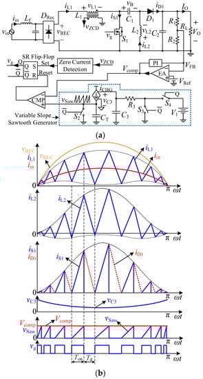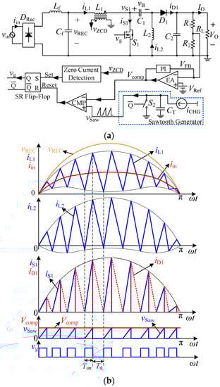 Figure 2b presents the operation waveforms of the SEPIC PFC circuit working in BCM with traditional COT control during half AC line period. At the start of each switching cycle, S1 is turned on; when the voltage vSaw of the sawtooth generator at the positive input terminal of comparator CMP increases to Vcomp, S1 is turned off. According to Figure 2b, the output voltage Vcomp of the error amplifier maintains constant in half the AC line period because the bandwidth of the control loop is usually much lower than the AC line frequency for the PFC converter [34,35]. Furthermore, since the slope of the sawtooth generator of COT control is fixed, the on-time of S1 is almost fixed when the converter operates in a steady state with a stable input voltage and output load.