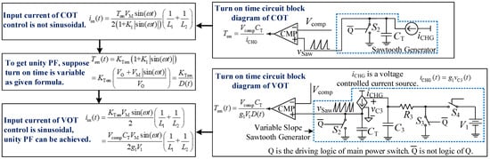 Observing Equation (9), the denominator of the equation contains (1 + K1sin(ωt)), which prevents the input current from being sinusoidal. Based on (9), suppose Ton can be controlled to be proportional to (1 + K1sin(ωt)), the unity PF may be achieved. Figure 3 illustrates a detailed block diagram for the developed procedure from COT control to VOT control, which can explain how the VOT control with variable slope sawtooth generator is proposed.
