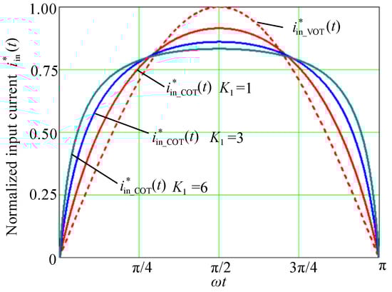 According to (27) and (28), Figure 5 shows both control schemes’ normalized input currents waveform with different K1 in half-line cycles. Observing Figure 5, the input current of the VOT control scheme is in shape with sinusoidal, but the input current waveform of COT control deviates from sinusoid, especially when K1 is large.