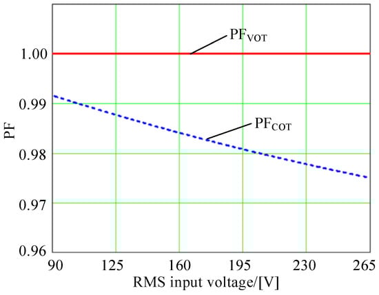 According to (26), (29), and the circuit parameters listed in Table 1 of Section 5, the comparison of the PF of COT and VOT control schemes with the variation of input voltage can be depicted in Figure 6. Therefore, it can be known that compared with COT control, the SEPIC PFC converter operating BCM with the proposed VOT control scheme based on variable slope sawtooth generator can improve the PF and realize theoretical unity PF.