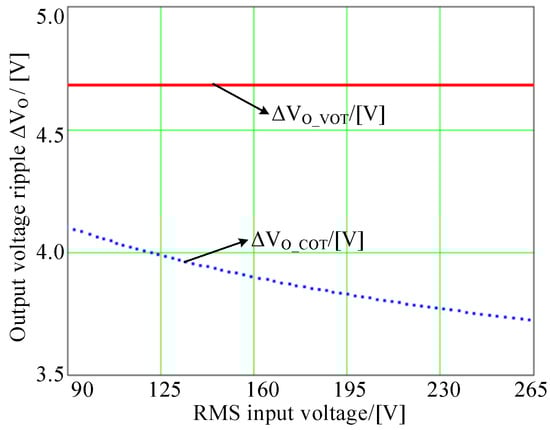 According to (32), (33), and the key parameters listed in Table 1 of Section 5, the output voltage ripple of both control schemes with different input voltage can be plotted in Figure 7. It can be known that compared with COT control, the output voltage ripple with the VOT control scheme is slightly larger.