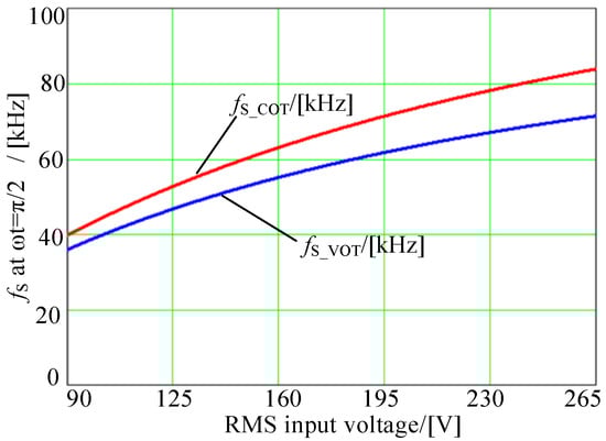 As the peak currents of the inductors L1 and L2 occur at ωt = π/2, it is important to analyze the switching frequencies of both control schemes at ωt = π/2 during designing both inductors L1 and L2. According to (35), (37), and the parameters listed in Table 1 of Section 5, the switching frequency of COT and VOT control at ωt = π/2 with the variation of RMS input voltage can be obtained in Figure 8.