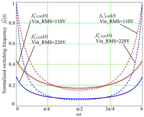 From (38) and (39), the normalized switching frequency variations curves with COT and VOT control schemes during half AC line period can be plotted in Figure 9.