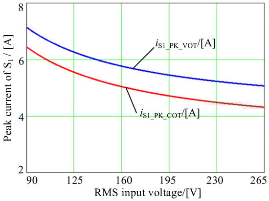 Comparison of the maximum peak current of S1 under different RMS input voltage.