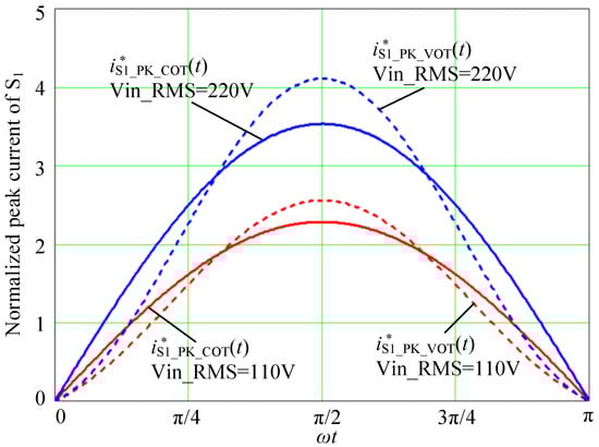 According to (24), (42), and (43), the normalized peak current curve of S1 of COT and VOT control during half AC line period is depicted in Figure 11. It is indicated that for the same RMS input voltage, compared with COT control, the peak current flowing through S1 of VOT control is higher when the transient input voltage is close to the peak value, the peak current flowing through S1 of VOT control is smaller when the transient input voltage is near zero crossing.