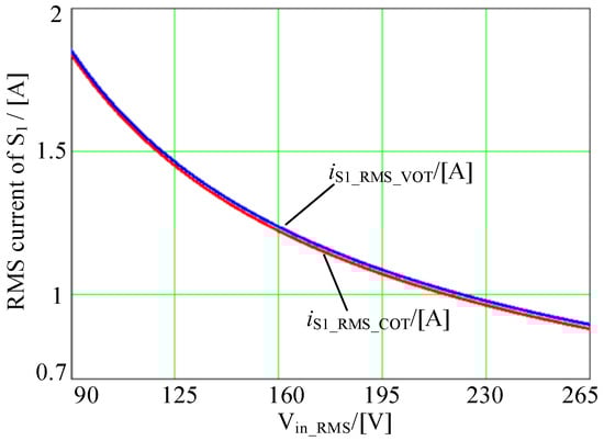 According to (1), (2), (5), (7), and (34)–(37), the RMS current of S1 with COT and VOT control can be obtained as