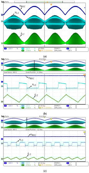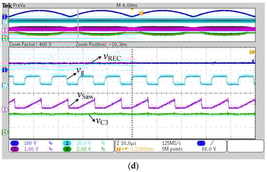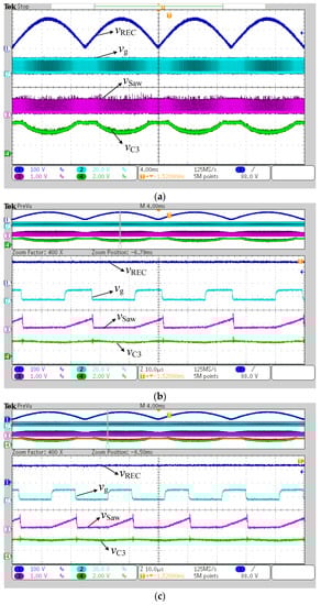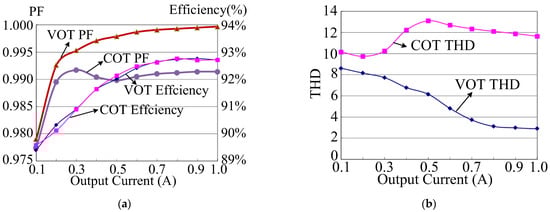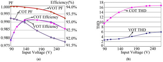 Figure 8 shows that the switching frequency of both control schemes increases with the increase of the RMS value of input voltage at ωt = π/2. According to Figure 8 and Figure 9, with the same RMS input voltage, the switching frequency of VOT is lower than that of COT control when the transient input voltage is near the peak value, i.e., when ωt is π/2; the switching frequency of VOT is greater than that of COT when the transient input voltage is near the zero crossing. This is because the range of the VOT control’s switching frequency variation is wider than that of the COT control. Hence, compared with COT control, the cut-off frequency of the input low-pass filter of VOT control is lower. Moreover, to avoid extremely high switching frequency, both BCM SEPIC PFC converters with COT and VOT control schemes should limit the main power switch’s maximum switching frequency or minimum turning-off time.