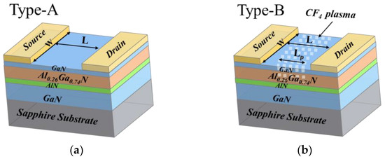 Two types of ungated HEMTs (A and B) were fabricated. Their structures are shown in Figure 1a,b. The epilayers were grown on a sapphire substrate via metalorganic chemical vapor deposition (MOCVD). From bottom to top, they consisted of a 6 µm thick unintentionally doped GaN buffer layer, 1 nm thick AlN interlayer, 21 nm thick Al0.26Ga0.74N barrier layer, and 2 nm thick GaN cap layer. The hall mobility was 1860 cm2/V s, and the 2DEG sheet density was 1.13 × 1013/cm2.