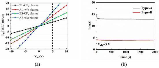 (a) The I–V curves of AL, AS, BL, and BS. (b) Ids-t curves for type- A and -B device at Vds = 5 V.