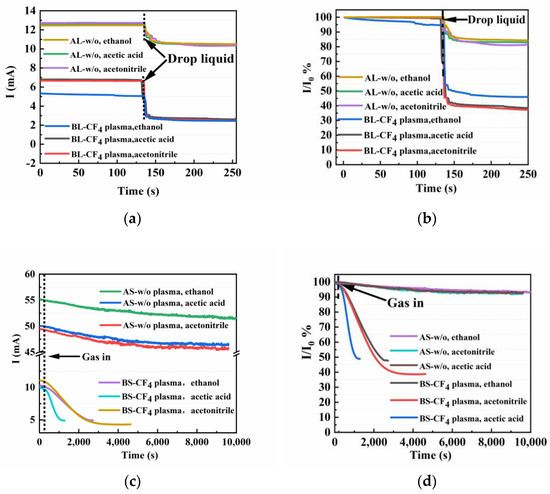 As shown in Figure 3c,d, the currents of the AS sample without F plasma treatment were reduced by about 3.25 mA (6%), 3.3 mA (7%), 3.5 mA (8%) by ethanol, acetic acid, acetonitrile gas ambient, respectively. The currents of the BL treatment with F plasma treatment were reduced by about 5.16 mA (52%), 4.71 mA (51%), 6.63 mA (61%) by ethanol, acetic acid, acetonitrile gas ambient, respectively. Compared with the AS and BS samples, the AL and BL samples show the same differences. However, the differences between the AS and BS samples are more significant. The current reduction rate of the BS sample (1000~2500 s) is more than 4 times that of the AS sample (~10,000 s). The current reductions in the BS sample (52%, 51%, and 61%) are more than 7 times those in the AS (6%, 7%, and 8%) sample. This means that AlGaN/GaN heterojunctions with CF4 plasma treatment are more sensitive to polar gases.