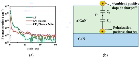 In an AlGaN/GaN heterojunction, as shown in Figure 5a, spontaneous and piezoelectric polarization induces positive and negative fixed charges at the interface and surface of the heterojunction [14,18]. Ambient doping causes positive ions to be adsorbed on the AlGaN surface, resulting in 2DEG generation in the channel. Two charge couplings have been established, i.e., polarization positive charges at the AlGaN/GaN interface with 2DEG in the channel, and the AlGaN surface’s polarized negative charges with the positive ions adsorbed on the AlGaN surface. For the fluorine plasma-treated AlGaN/GaN heterojunction, there were F− ions located in AlGaN barrier, as shown in Figure 5b. There were, additionally, two types of coupling dipoles. Some F− ions coupled with the positive polarization charges at the AlGaN/GaN interface, which reduced the 2DEG density. Other F− ions coupled with the positive surface ions. It should be noted that there were much more positive surface ions in the AlGaN/GaN heterojunction with fluorine plasma treatment than in the AlGaN/GaN heterojunction without fluorine plasma treatment.