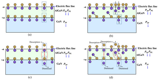In the thermal equilibrium state of the AlGaN/GaN heterojunction, electric neutrality is a basic requirement. Those F− ions should be compensated by the same amount of positive charges coming from the AlGaN/GaN interface and AlGaN surface. Based on the static electricity principle, as shown in Figure 4b, the number of positive charges in an AlGaN/GaN interface and AlGaN surface could be estimated by the following equations.