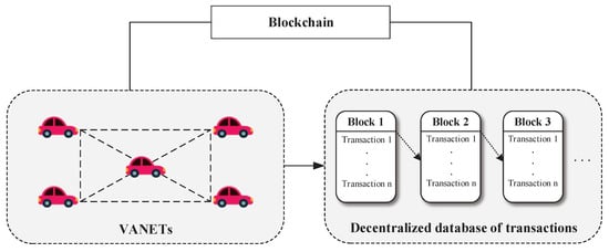 Researchers have provided a series of methods of blockchain deployment in IoV. There are usually two existing entities in IoV: vehicles and roadside units (RSU). The communication styles are divided into vehicle-to-vehicle (V2V) communication and vehicle-to-infrastructure d(V2I) communication. It is common to consider blockchain as a decentralized database. Regarding the process of initial V2I authentication as a transaction, blockchain make use of its chain structure to storage the vehicles’ partial autentication information. Thanks to its chain structure, blockchain can guarantee data consistency, thus making it possible to realize cross-domain authentication. In IoV, RSUs are usually chosen as miners to commit ledgers because they are more stable and secure than vehicles. In the following V2I and V2V authentication phase, RSUs only need to search for the information of vehicles requiring authentication in the blockchain. As a consequence, there is no need for a third-party certification center to always be online. Combing blockchain and IoV enables IoV to further improve its authentication efficiency and scalability [12]. The deployment of blockchain in IoV is shown in Figure 1.
