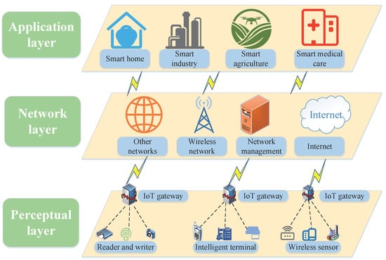 The IoT is mainly composed of a perception layer, network layer, and application layer, as shown in Figure 2 [13]. The perception layer mainly collects and captures the state information of the external environment or items through sensors, which use radio frequency identification(RFID) and communication technologies, and transmits the information to the upper layer. Common attacks in perception layer include side channel attacks, denial of service (DoS) attacks, witch attacks, and so on [14,15]. Based on the existing Internet and mobile communication network, the network layer stores, manages and analyzes data collected by sensors through the cloud computing platform and transmits it to the application layer. Common attacks at the network layer include man-in-the-middle attack, network listening, and routing attack. The application layer provides services to users through the application layer protocols of the IoT. Common attacks include identity forging attacks, injection attacks, and replay attacks. Due to the vulnerability of the IoT network, a secure IoT authentication protocol must meet the requirements of reliability, integrity, privacy, anonymity, forward security, and non-repudiation [16].