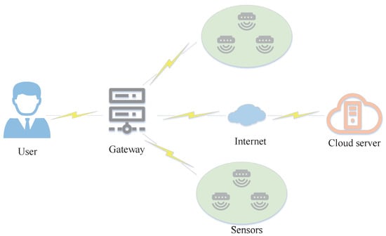 At present, the application scenarios of user and device authentication mainly include users, gateways, wireless sensor networks, and sensors. These scenarios are sometimes accompanied by cloud servers, as shown in Figure 4. In the wireless sensor network, users can access the sensor after being authenticated by the network gateway. The gateway periodically uploads data to the cloud server, and users can access the data after mutual authentication with the cloud server. Previous studies [25,26,27] proposed a two-factor authentication protocol for wireless sensor networks based on ECC to realize mutual authentication among users, sensors and gateways. A two-factor authentication scheme of wireless sensor networks proposed by Vaidya et al. [28] only uses a simple hash function and an exclusive OR(XOR) function for encryption. Hu et al. [29] proposed a three-factor authentication scheme in the industrial IoT environment, and a cloud server can regularly process the data uploaded by the gateway. Other studies [30,31] have proposed the authentication protocol of wireless sensor networks based on smart cards to realize the mutual authentication of users and sensor nodes.