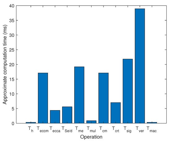 The performance evaluation of authentication schemes is usually considered from three aspects: security, computing overhead, and communication overhead. In terms of security analysis, it mainly evaluates the security of the scheme design, which is generally divided into formal security analysis and informal security analysis. Before security analysis, it is necessary to make assumptions about the attack model of the system. The most common model is the Dolev–Yao model [32]. Informal security analysis is mainly used to analyze the security of the scheme through literal description and inferencing, which is difficult to understand. However, most informal security analyses could only analyze known attacks. Formal security analysis refers to the use of existing security analysis tools to detect possible vulnerabilities in the scheme, including model detection methods, theorem-proving methods, and belief logic methods. The common model detection methods used in papers are Automated Validation of Internet Security-sensitive Protocols and Applications(AVISPA), the tool-theorem-proving methods include ProVerify, and the belief logic methods includ Burrows–Abadi–Needham(BAN) logic. Formal security analysis requires the dedicated study of different rules of distinguished tools. Compared with formal security analysis, the access threshold of informal security analysis is higher. The communication overhead refers to the total amount of data received and sent by each entity in the scheme, usually in bits or bytes. First, the length of the large prime number selected by the system is assumed. Then, the message length after the implementation of the cryptographic algorithm is estimated according to the characteristics of each cryptographic algorithm. The communication overhead of each entity is evaluated mainly by adding the message length of the cryptographic algorithm used. The calculation overhead refers to the total running time of each encryption algorithm implemented by each entity in the scheme, usually in ms [33,34,35].