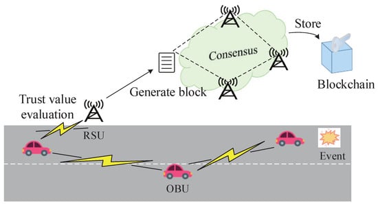 Because of the central design, there are some problems, such as a high time delay, a single point of failure, and poor expansibility, which do not meet the demands of the IoV [64]. Blockchain technology applied to the field of trust management of car networking can establish a safe and reliable distributed database and improve the security of car networking. In this mechanism, a blockchain network is constructed by vehicle nodes, RSU, and its servers, and the trust value of vehicle nodes is regarded as a transaction in the IoV, forming a new block in a manner similar to transactions based on Bitcoin. The hash values of each block are chained together in order. Among them, the vehicle nodes only communicate messages and do not participate in data calculation. RSU verifies the authenticity of the event, and its server calculates the corresponding message trust value and then selects one of the nodes for accounting according to the consensus mechanism. All the trust values in the blockchain are accumulated to form a comprehensive trust value of vehicle nodes, which is transmitted, stored, and maintained in the network. There are two kinds of data in blockchain networks: block data and status data. Among them, the block data refers to the record of every transaction in the blockchain, and the state data refers to the information of the current state of the vehicle node. The model diagram is shown in Figure 6.