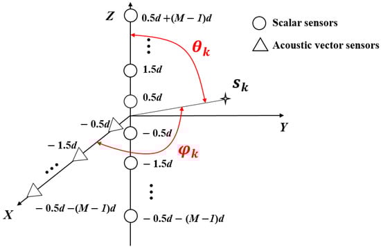 As shown in Figure 1, in order to extend the same virtual array aperture in two directions, the proposed hybrid T-shaped sensor array consists of two orthogonal uniform linear arrays (ULAs) (denoted by X-ULA and Z-ULA, respectively) in the XZ plane, where the X-ULA has M acoustic vector sensors with spacing d, and the Z-ULA has 2M scalar sensors with spacing d. More precisely, the element positions in the X-ULA are given by {0.5d, 1.5d, …, 0.5d + (M − 1)d}, and the ones in the Z-ULA are given by {−0.5d − (M − 1)d, …, −1.5d, −0.5d, 0.5d, 1.5d, …, 0.5d + (M − 1)d}. The K narrow-band far-field uncorrelated signals with the power impinge on the array. The presence of kth source sk with elevation angle and azimuth angle is shown in Figure 1. Let and , where denotes the wavelength of the incident signal, and then the spatial steering vectors of X-ULA and Z-ULA can be represented as and , respectively.