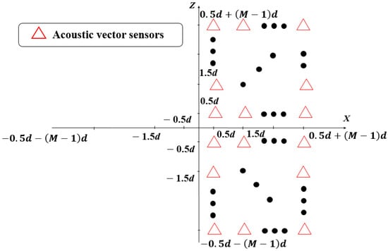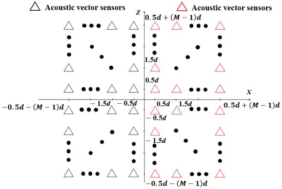 Similar to Equations (5) and (7), tensor corresponds to a larger virtual URA, which contains all the acoustic vector sensors in the XZ plane as depicted in Figure 4. In addition, the element spacing of this larger virtual URA is d, which depends on the inter-sensor spacing of the physical T-shaped array.