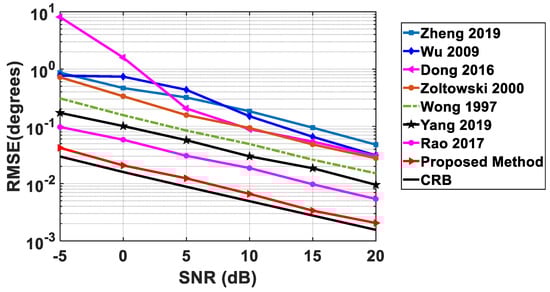 This example investigates the processing performance of the proposed method concerning SNR. In the proposed method, we utilize 6 acoustic vector sensors (containing 24 sensor components) and 12 scalar sensors. For the purpose of comparison, we consider scalar sensors as a component of vector sensors. Now, this proposed array contains 36 sensor components. Therefore, 36 vector sensor components are used in [15,16,21], under the same array cost. The SNR is varied from −5 dB to 20 dB. The azimuth and elevation angles of the two sources are set to (46°, 55°) and (48°, 62°), respectively. The snapshot number is set to 500. References [15,16,21] can allow 100× half-wavelength spacing, but the graph is constructed setting this to only 5×, i.e., d = 5 × (λ/2). The inter-sensor spacing of other methods is set to be (λ/2). From the results in Figure 6, we can see that [15,16,21] have better performance than [10,12,31] due to the array aperture advantage. Note that although the method in [13] utilizes the scalar sensor array needing at least one inter-sensor spacing not larger than half a wavelength, it can achieve a much higher DOF than [15,16,21]. Therefore [13] also shows better performance. The proposed method can simultaneously offer DOF as in [13] and large array aperture as in [15,16,21]. Accordingly, the proposed method has the smallest RMSE among all considered methods.