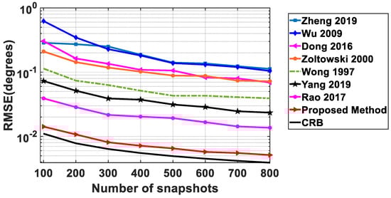 To prove that our array can achieve better performance under the same array cost, we compare it with the vector sensor arrays of large array aperture [15,16,21]. In addition, since our array contains scalar sensors, some scalar arrays with high DOFs [10,12,13] are used as benchmarks. All the simulation results are obtained via 100 Monte Carlo trials. The root mean square error (RMSE) of parameter estimation is defined as