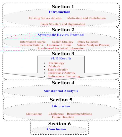 Overall, this study covers the topic at hand through various aspects and stages, as follows: Section 2 presents information sources, search strategy, study selection, inclusion and exclusion criteria, the article analysis process and the related results, as well as statistical data on indoor localization. Section 3 discusses the technologies applied and the details of data collection. It focuses on studies related to pedestrian activity and evaluation performance. Section 4 describes the substantial analyses based on the reviewed articles. This section presents the reasons for integrating indoor localization into smartphones. Section 5 discusses the most prevalent motivations, issues, and challenges, as well as recommendations for future directions. This study is concluded in Section 6. Figure 1 illustrates the overall structure of this article.