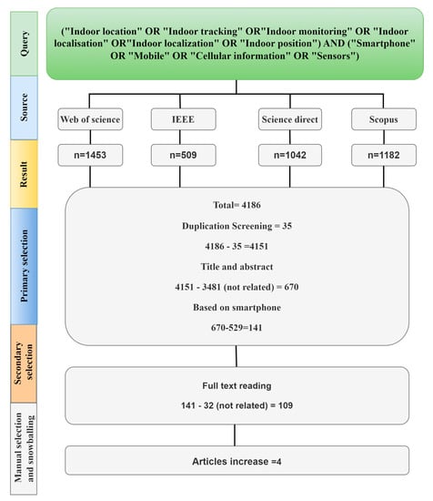 First, 4186 articles were collected (1182 articles from Scopus, 1453 articles from WOS, 1042 articles from ScienceDirect, and 509 articles from IEEE Explore). After the filter process, 35 duplicate articles were discarded. Next, 3481 articles were further excluded after titles and abstracts were checked, leaving only 670 articles. An additional 529 papers were excluded because they focused on smartphones. In the final full-text review, another 32 articles were removed. In total, only 109 articles were found in secondary selection to cover a wide range of subjects and methods related to indoor localization using smartphones. Table 1 shows the selected articles based on the technology used in indoor localization, which includes Wi-Fi, Bluetooth, RFID, acoustic, geomagnetic, and other technologies to provide accurate indoor localization and tracking.