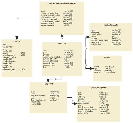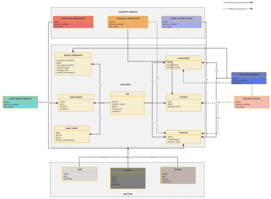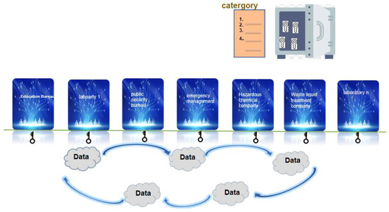 If an accident happens in the laboratory, we could obtain cross-domain and cross-branch information by each unit’s authorization in real time. The proposed structure, which can search the corresponding hazardous chemical information, equipment details, relevant personnel profile, and experimental project proposal, etc., is shown in Figure 8.